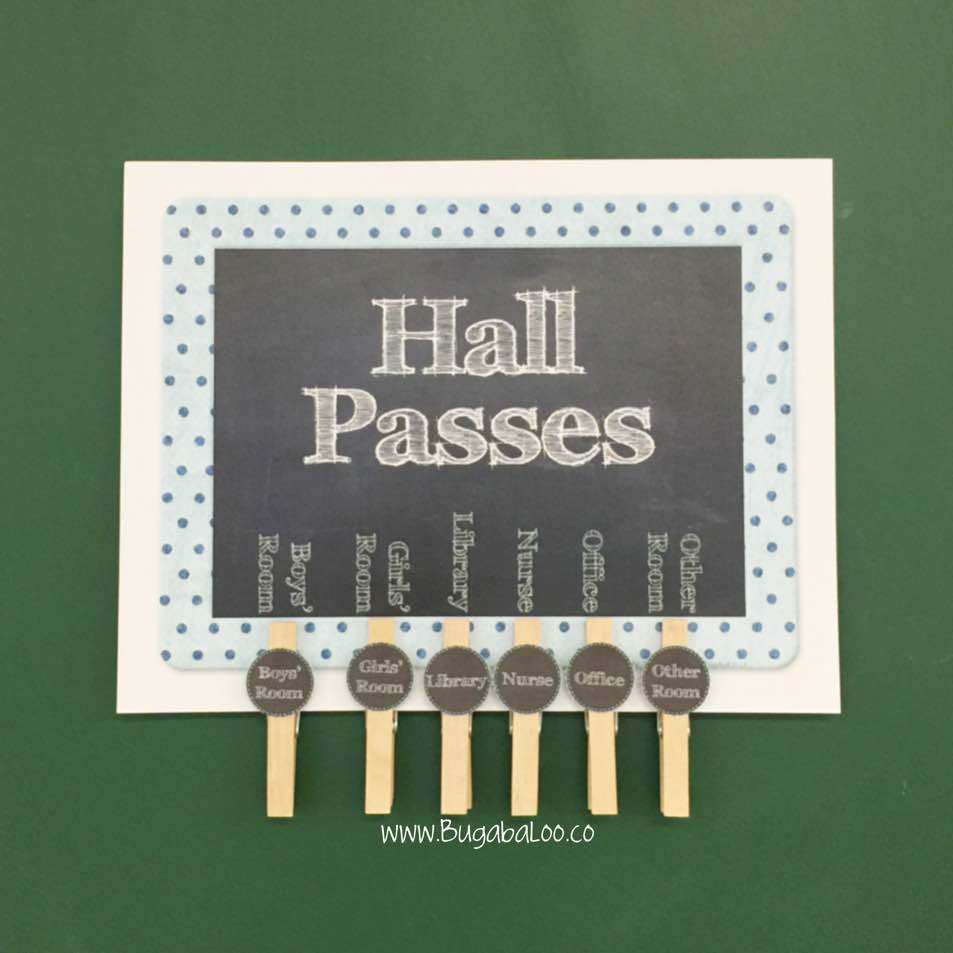 Printable pages are in PDF format and includes one completed hall pass sign, one blank hall pass sign, six completed clothspin labels, and twelve blank labels, and a full set of instructions for creating your own hall pass sign with clothespin passes.